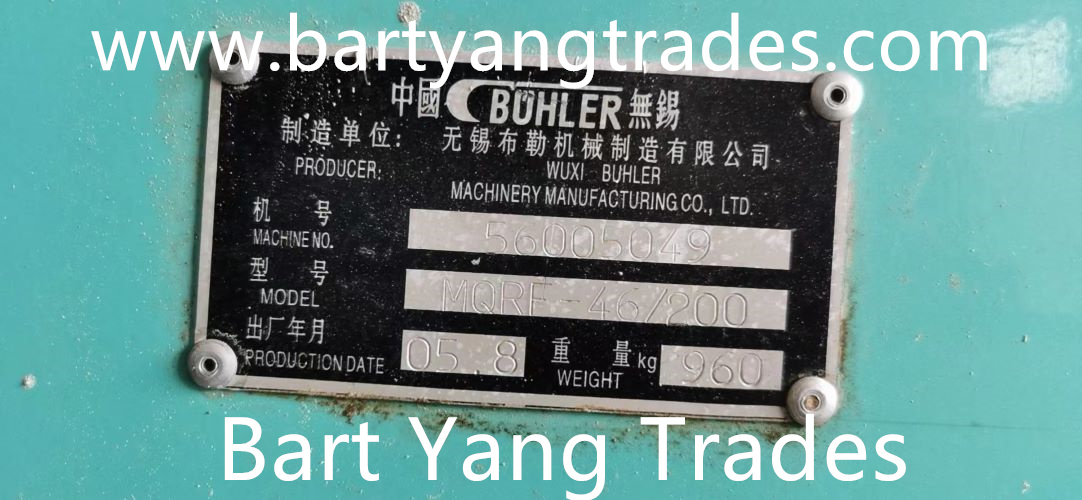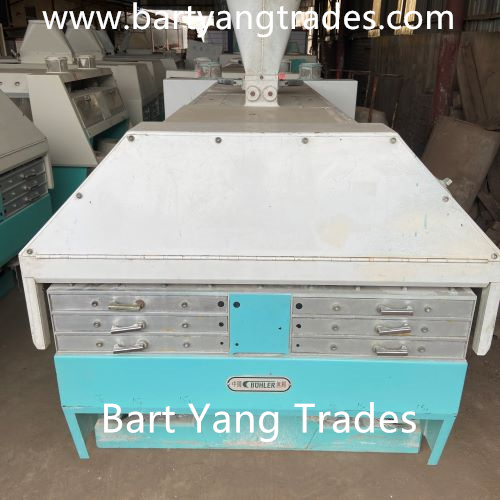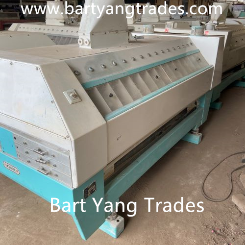 Bart Yang Trades supplying new and used Flour Milling Machines and flour mill spare parts; reconditioned renewed 99.9% BUHLER MDDK MDDL 250/1000 250/1250 Rollstands, Roller Mills; Used Buhler MDDK MDDL Roller mills, Used Buhler MTSD120/120 Destoners, MHXT45/80 Scourers, Used Ocrim Roller Mills, Used Simon Roller Mills, Used Sangati Roller Mills. Spart Parts: Plan sifter cleaners, frames, Sieving cloth, inset frames, buhler purifier spare parts, purifier frames, purifier brushes, purifier rubber springs, flour mill spouting pipes.